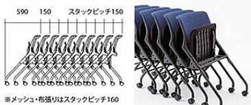 座を跳ね上げるだけで簡単・コンパクトに水平スタッキングができ、省スペースの収納が可能です。